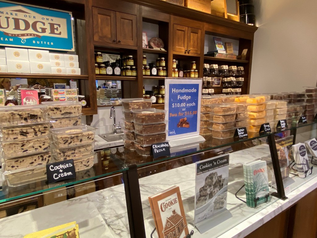 The Arch Store makes its own fudge several days a week in a specially designed kitchen and we sell it at our historically themed fudge counter in the back of the store, often after giving customers free samples to try.  Our best-selling flavors are Chocolate Sea Salt Caramel, Peanut Butter-Chocolate and Gooey Butter Cake.  Mmmmm.