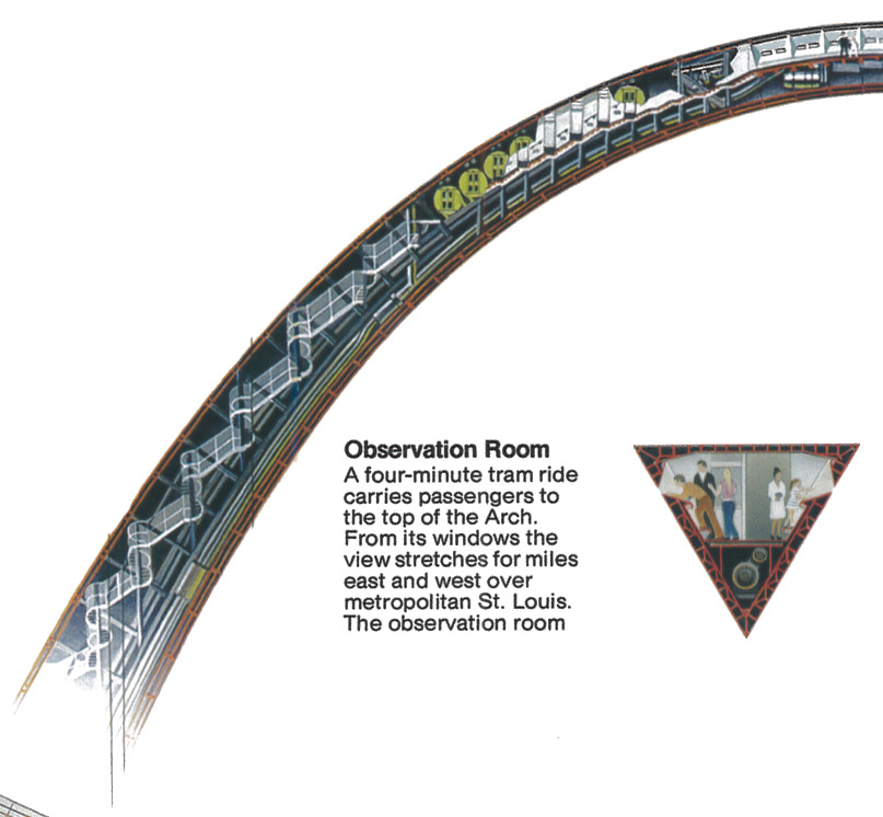 The Arch tram ride was conceived in just two short weeks by a humble man who never received a college degree.  Dick Bowser was a 38-year-old second-generation elevator manufacturer working in Des Moines, Iowa, when Gateway Arch architect Eero Saarinen asked him to develop a way to bring visitors to the top of the Arch and back down. The project was extremely challenging given the curve of the Arch (it is much narrower at the top than at the base), and the fact that he had to leave room for an observation platform at the top as well as space for a maintenance crew stairway.