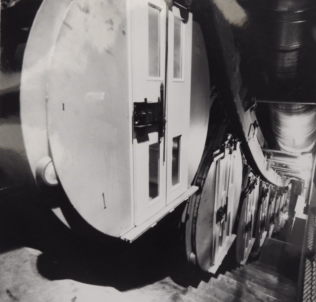 Another challenge was Saarinen’s timeline – Bowser was given just two weeks to submit a design for the Arch passenger system!  Working day and night at home in his basement, he came up with a concept that borrowed from the mechanics of both Ferris wheels and elevators, resulting in a small curving train of linked passenger capsules.  His tram concept was accepted by Saarinen and his team.  Bowser was hired to build and install the tram, which opened in 1967, two years after the Arch itself was completed. He then served as tram maintenance supervisor until 1972.
