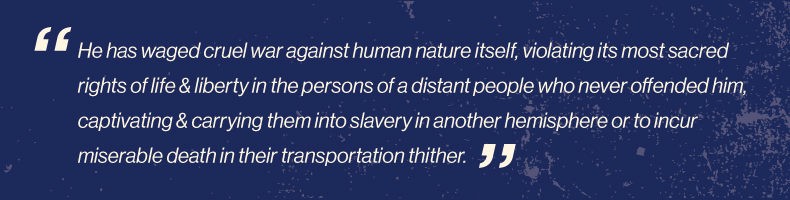 Yet over time, Jefferson began to see slavery as a “moral depravity.” In fact, as he was writing the Declaration of Independence in 1776, he included a 168-word anti-slavery clause that blamed King George III for his role in creating and perpetuating the slave trade. Some of the accusations he made: