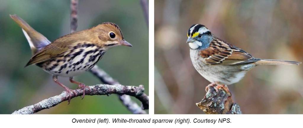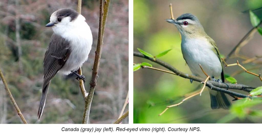 The six most common were the ovenbird, red-eyed vireo, Nashville warbler, white-throated sparrow, and blue jay, in that order. Many birds, such as the white-throated sparrow and the Canada jay, find their way to the park from conifer forests extending all the way to the Arctic.