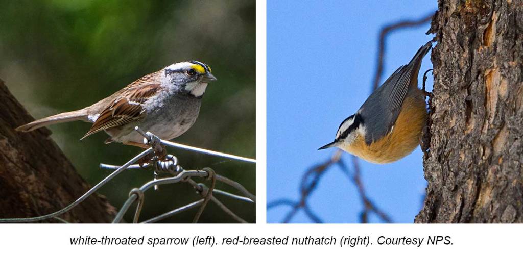 Researchers also predict a good news/bad news scenario in the future. One NPS study analyzing two different climate scenarios predicted a high turnover of species in the park by mid-century (2041–2070) if the nation continues on its current path of rising greenhouse gas emissions. In fact, two of the most common species at Voyageurs today – the red-breasted nuthatch and the white-throated sparrow – are predicted to disappear from the park by mid-century, while the nuthatch may only appear during the winter months.