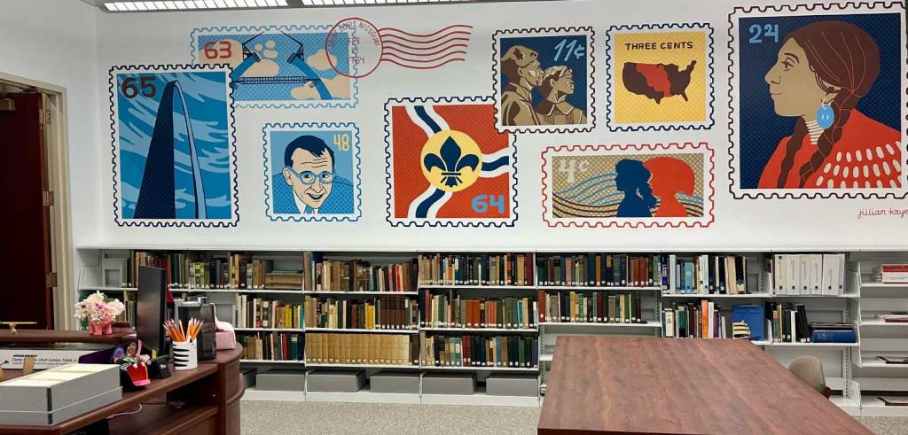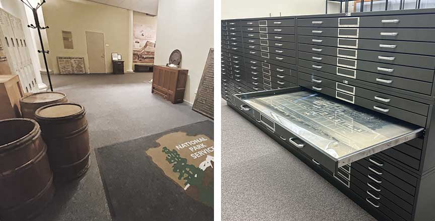 A fun new addition to the Archives Reading Room is a custom mural by local artist Jillian Kaye, who won a recent design competition hosted by JNPA. The mural on the reading room wall uses postage stamp designs (a nod to the Old Post Office site) that depict various themes from the park’s history.