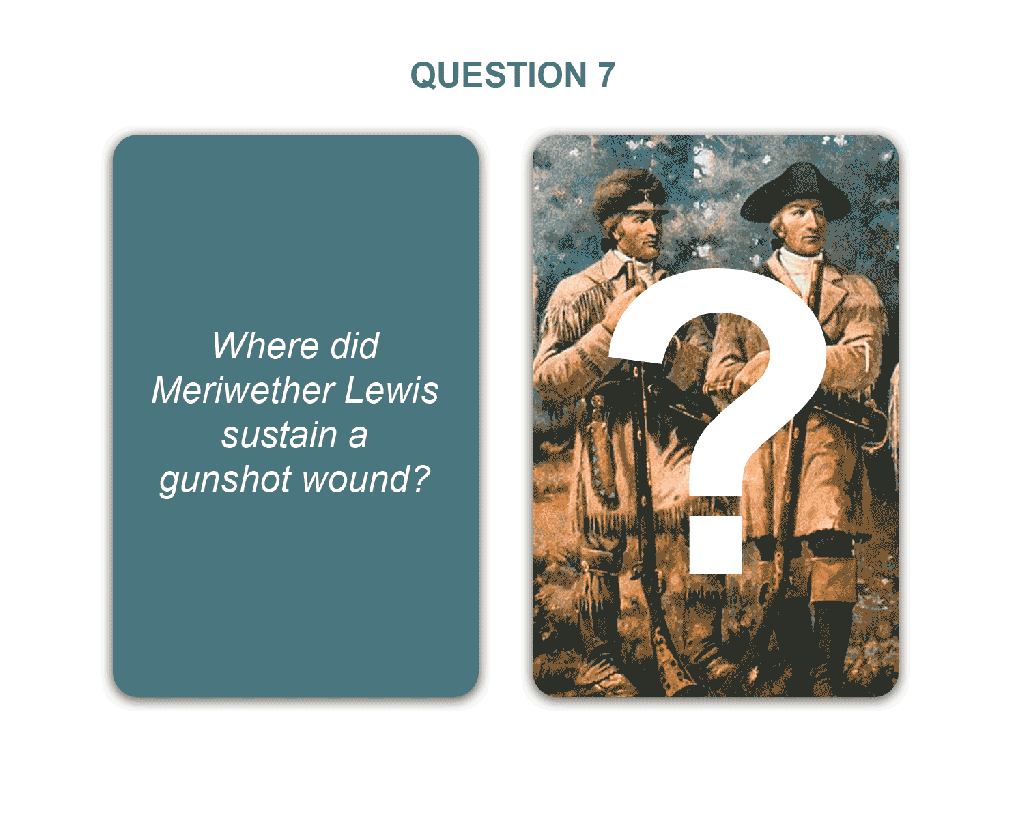 When the expedition was headed home in August 1806, Lewis and his one-eyed boatman Pierre Cruzatte went elk hunting on a willow island. They both fired on the herd, killing one elk and wounding another. As they tracked the wounded animal, Lewis felt a shot in his left buttock. He later wrote: