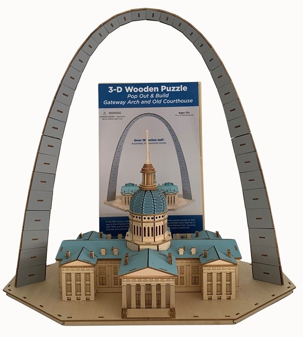 If two-dimensional puzzles aren’t your thing, how about trying your hand at some tricky 3D building sets? Warning – they’re challenging! We offer two buildable models of the Gateway Arch and Old Courthouse, one made from plastic mini-blocks and the other from wood.