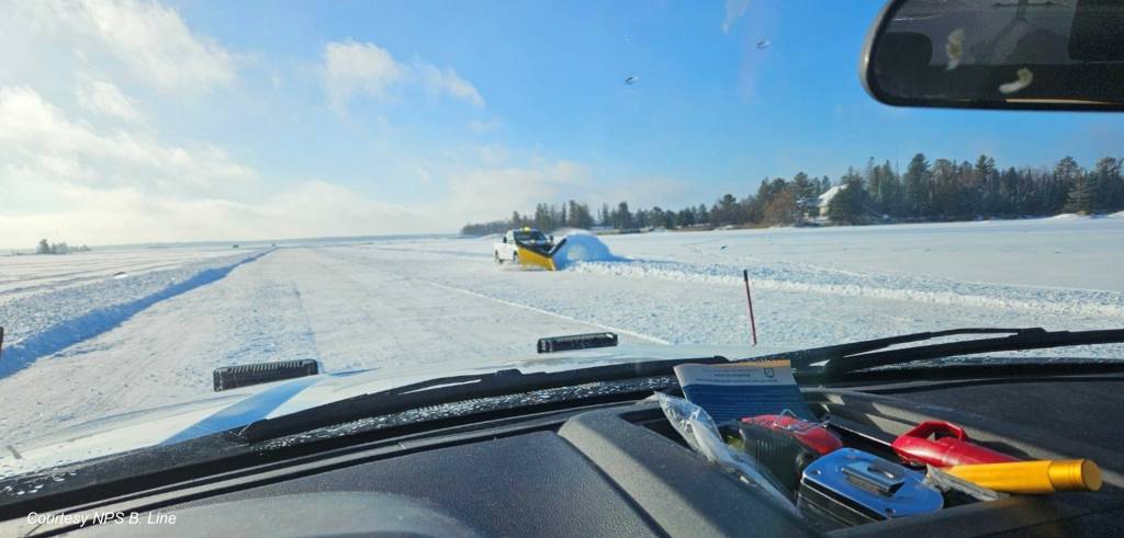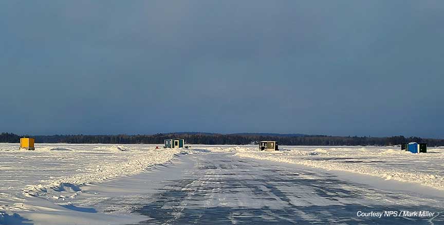 Every winter, park staff members clear snow from parts of Rainy Lake and Kabetogama Lake, creating ice roads that visitors can use. The roads are open to cars and trucks weighing less than 7,000 lbs. (Snowmobiles are not permitted). The speed limit is 30 mph. The roads are typically very wide – up to 60 feet or more – giving vehicles plenty of room to park and spread out.