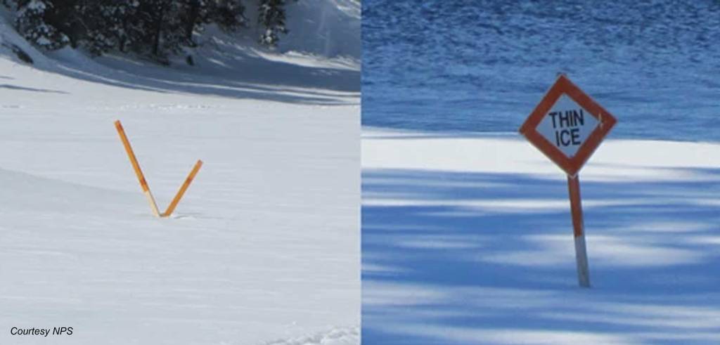 The park takes visitors’ safety very seriously. When heavy snow, slush, or thin ice exists, an ice road may be closed or shortened for safety. Specially trained staff test the ice thickness frequently and they post warning signs when the roads are unsafe for travel.
